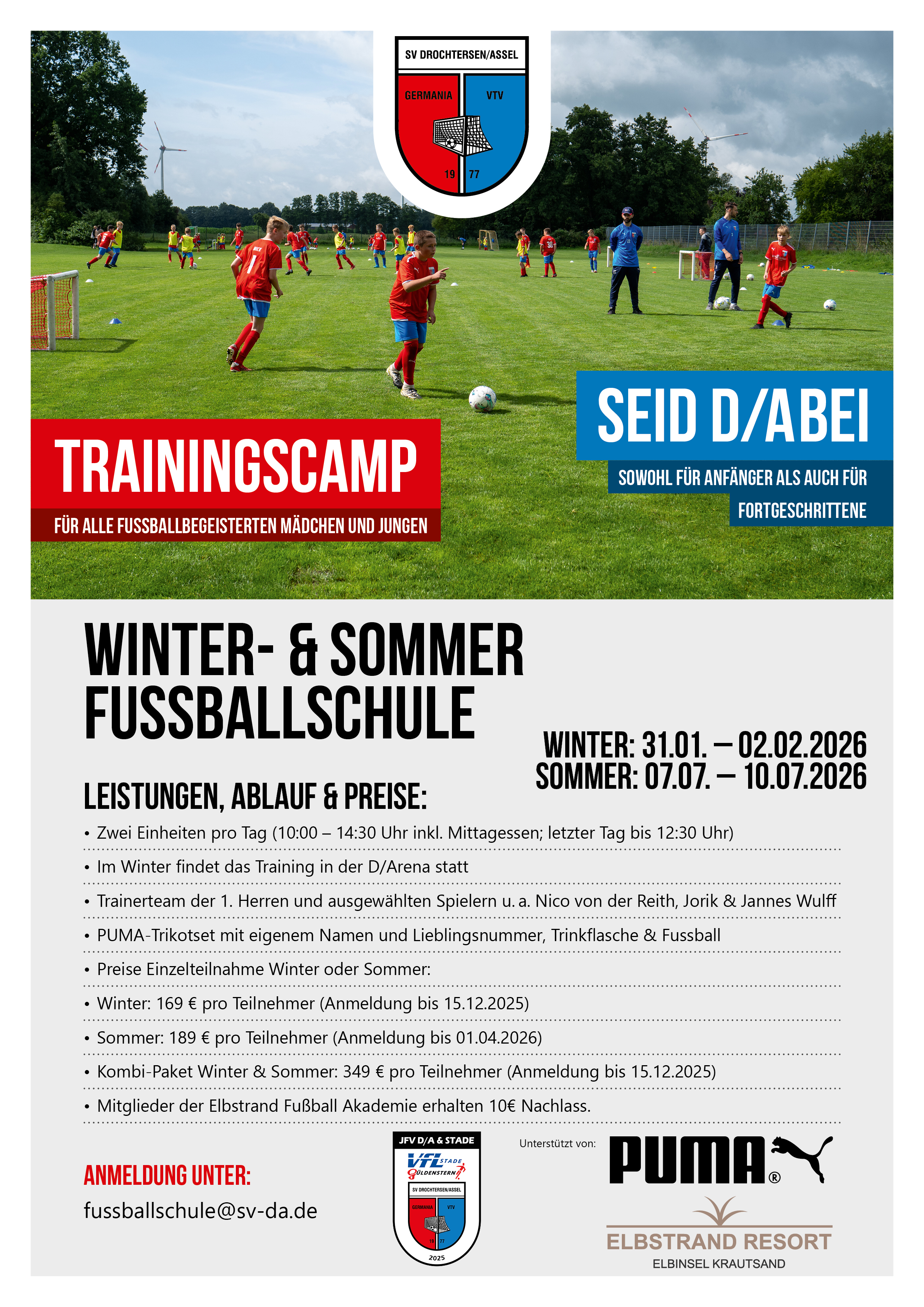 Die SV Drochtersen/Assel lädt alle fussballbegeisterten Kinder im Alter von 6-14 Jahren herzlich zur Teilnahme an ihrer Fußballschule im Winter und im Sommer 2026 ein! Die aufregende Möglichkeit, von den Spielern der ersten Herrenmannschaft zu lernen, verspricht nicht nur Spaß, sondern auch eine erstklassige Ausbildung.